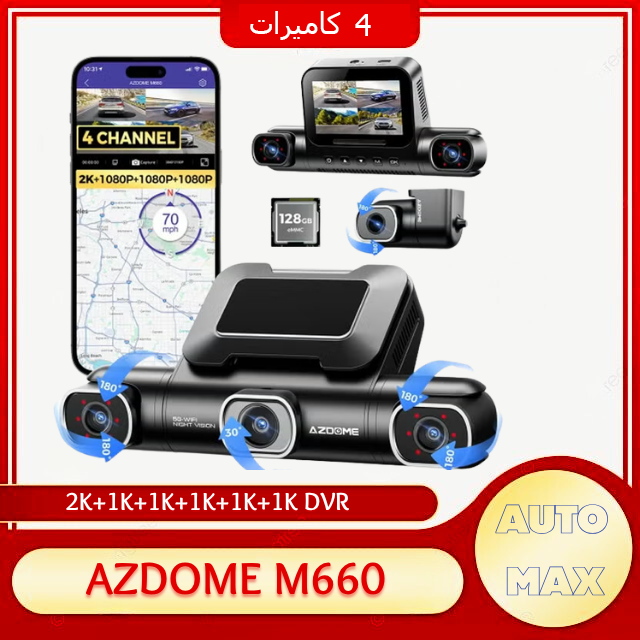 كاميرا الداش الجديدة كليًا Azdome M660 هي خيارك الأفضل إذا كنت ترغب في تصوير جميع جوانب سيارتك: الأمام، الخلف، الداخل، اليمين واليسار، عبر كاميرا داش بأربع عدسات. مواصفات ومميزات الكاميرا: جودة تصوير الكاميرا الأمامية: 2K، وباقي العدسات بدقة 1080P Full HD.