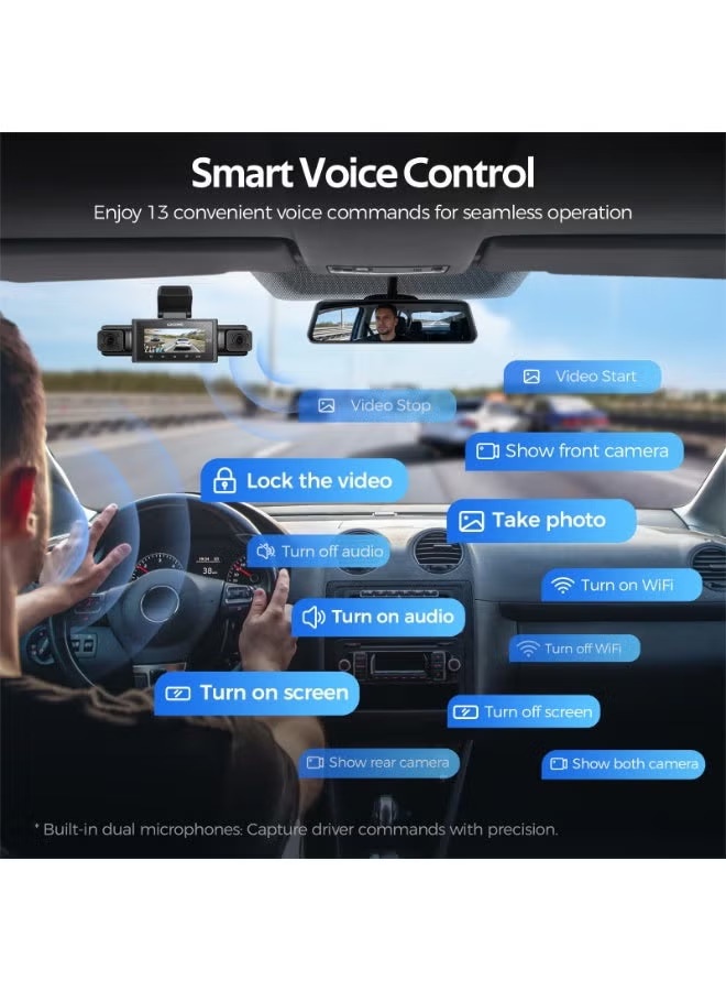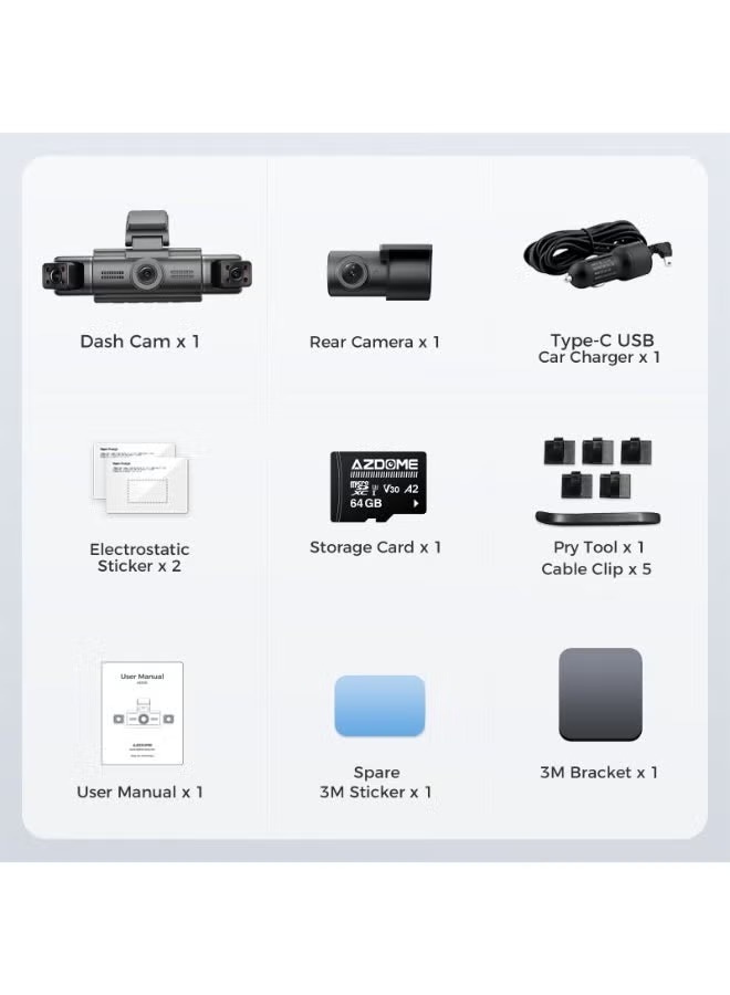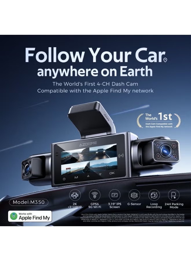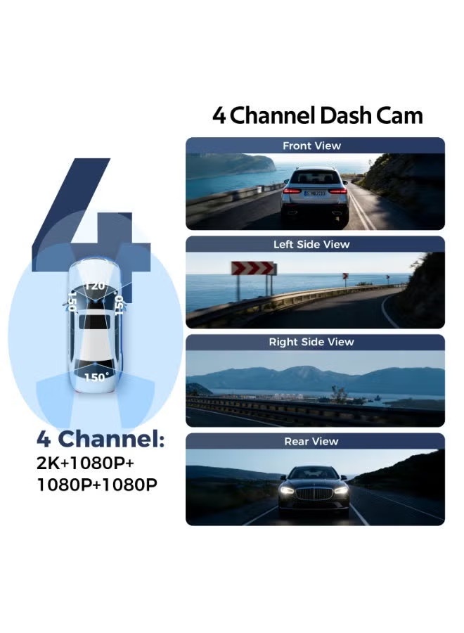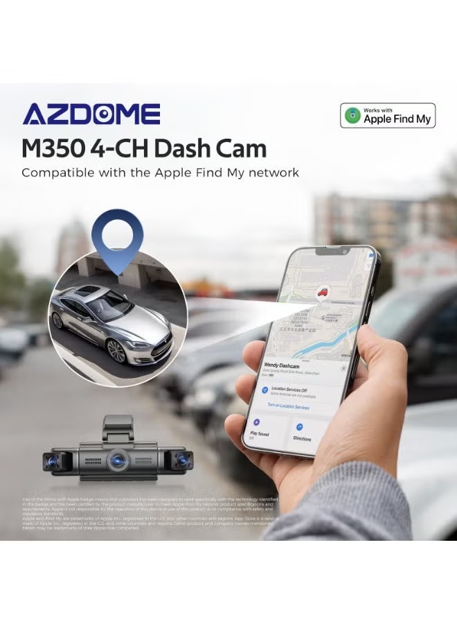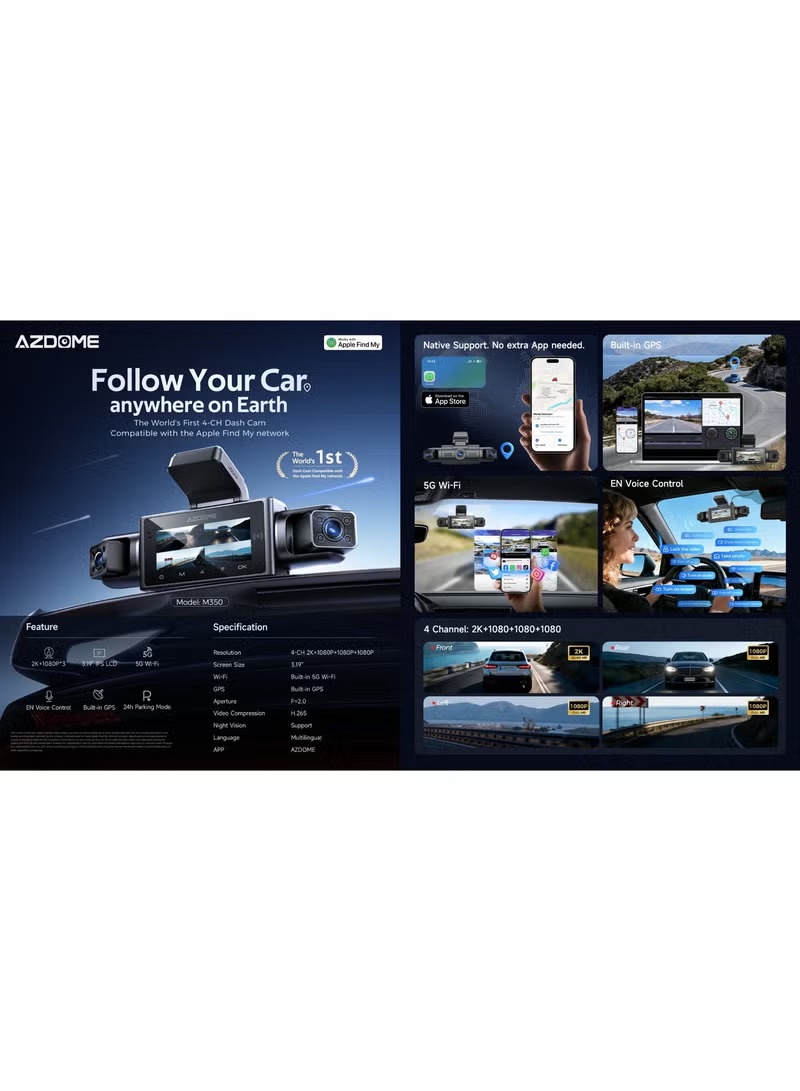 كاميرا AZDOME M350 بأربع قنوات تقدم تغطية كاملة لمحيط السيارة بجودة صورة ممتازة وحماية ذكية على مدار الساعة. تعمل الكاميرا الأمامية بدقة 2K بينما تسجل القنوات الثلاث الخلفية والداخلية بدقة 1K لتوثيق كل ما يحدث من جميع الزوايا بوضوح عالي — حتى في ظروف الإضاءة المنخفضة.